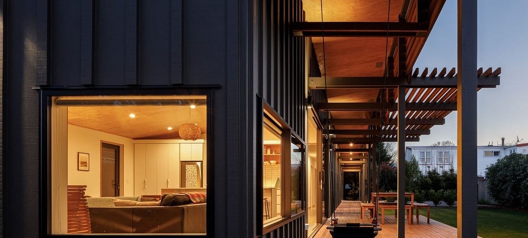 “Timber has been used extensively throughout the design with silvered macrocarpa cladding and structural glulam timber portals.