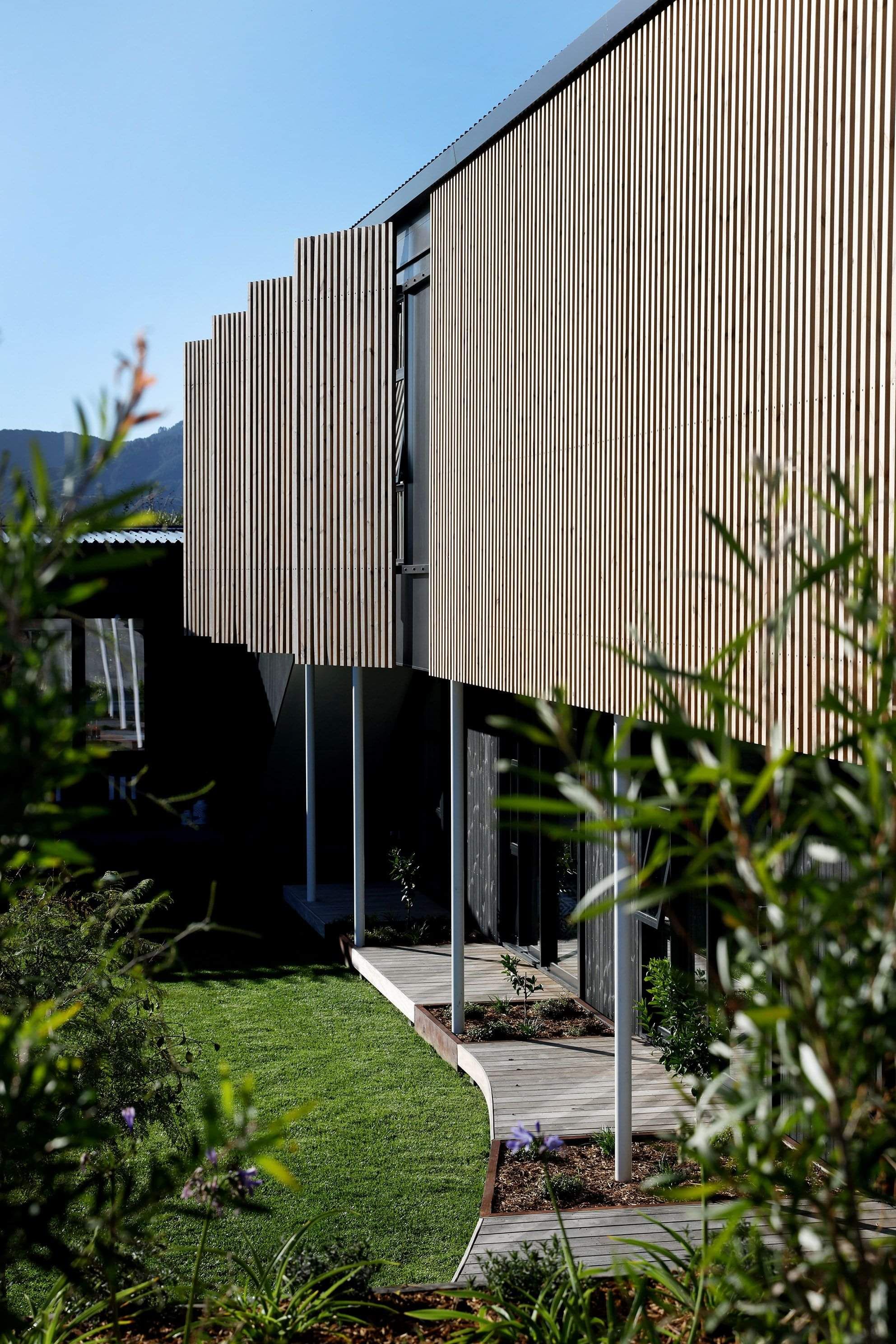 The vertical timber fins create a dynamic outer layer to the home, casting changing shadows across the façade throughout the day while softening the building’s scale within the neighbourhood.