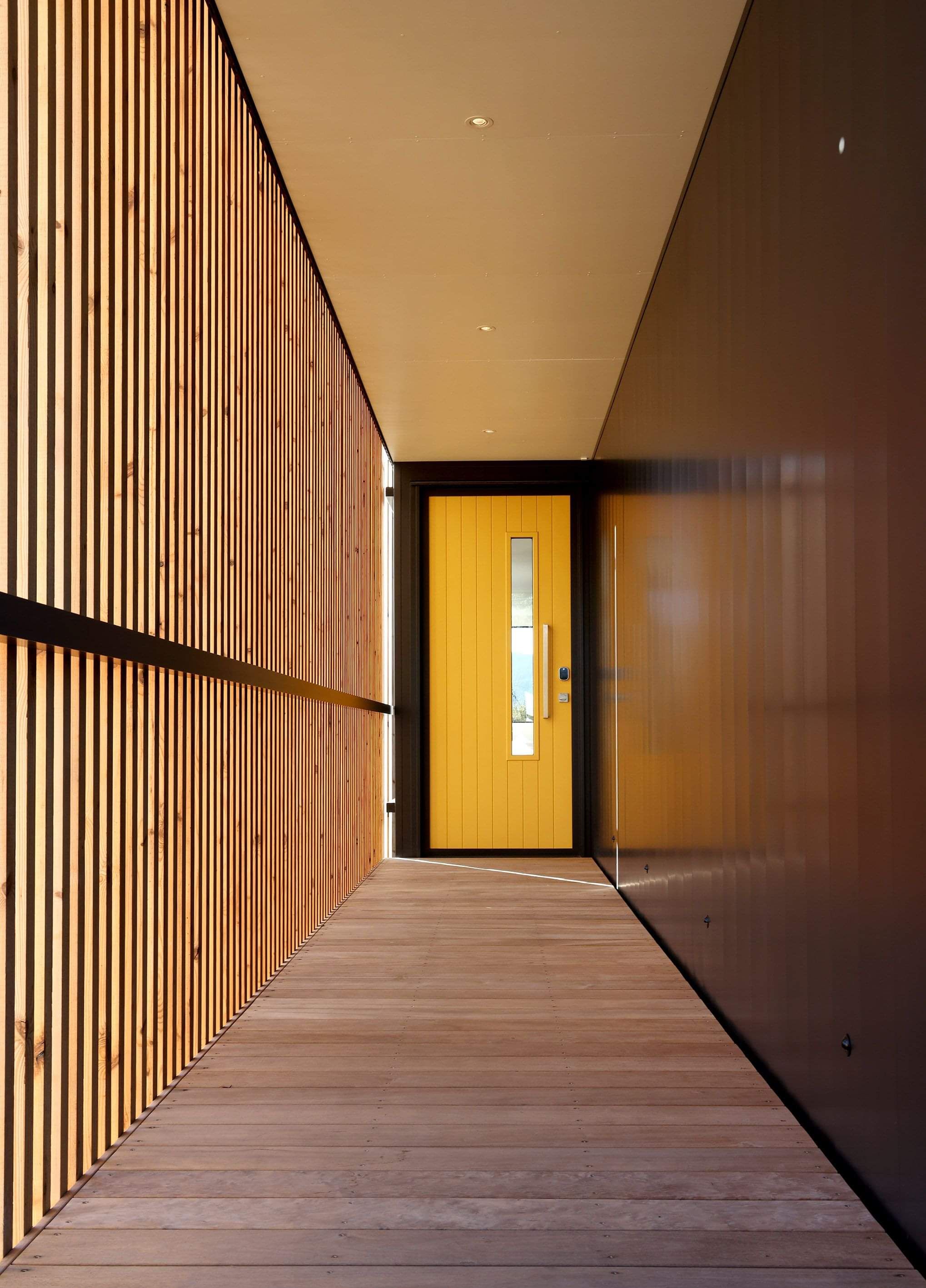 A bright yellow entry door marks the threshold to the home, providing a moment of colour and warmth within the otherwise restrained palette. Internally, large windows and sliding doors ensure the living areas remain filled with natural light, reinforcing the connection between architecture, landscape and family life.