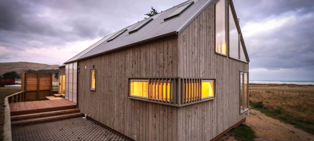 This home, for a recently retired local farming couple, is situated within the Martinborough Estate residential development on a large, flat, open site – bordered by established trees and directly adjacent the fairways of the Martinborough Golf Club. The brief was to create a home that could accommodate visiting grandchildren and guests, with connected outdoor living that was sheltered by the significant prevailing winds as well as connecting to the park like aspect and golf course beyond. The building is four bedrooms, open plan mezzanine, open plan living/dining/kitchen, study, three bathrooms and double garage + workshop/laundry – organised around four wings connected with flat roofs. With such an expansive site the initial challenge was to organise the programme so that the building form did not appear as an isolated mass within the landscape. In this case the separate wings allow the form to graduate into the site with pergolas and decks further blurring the edge between building and wide-open spaces beyond. With a fortunate north facing aspect the spaces have been spread along a long east-west axis with the large central volume accommodating the living areas and acting as a central hub, where the adjoining spaces (study, mezzanine, outdoor living) can be opened or closed off as required. The extended soffit over the northern veranda is supported with a large structural pergola and was modeled precisely to allow good thermal gain during the winter months while effectively shading the interior during the summer. Stylistically the building is a modern take on traditional gabled forms referencing the clients previous farm house, updated with detailing such as the structural pergola, exterior screens, monochrome colour scheme and large areas of north facing glass. This theme is carried through to the interior where clean white joinery is offset with timber reclaimed from the client’s old shearing shed. A central component to the brief was a useful outdoor living space as well as areas to catch the sun during the day while maintaining a comfortable interior temperature. With a prevailing north-west wind the solution was to continue the main living room gable to the east and treat the outdoor living as a continuation of the interior living room. With the ability to open the expansive glazing the clients have found this an ideal solution.