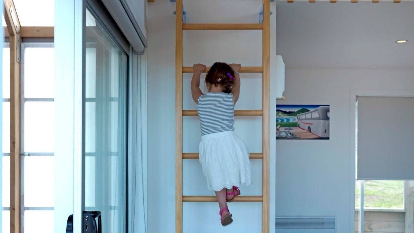 Donna Holmes’ grand-daughter Sunny climbs the ladder to the mezzanine floor, where the children throw their mattresses down to sleep at night.
