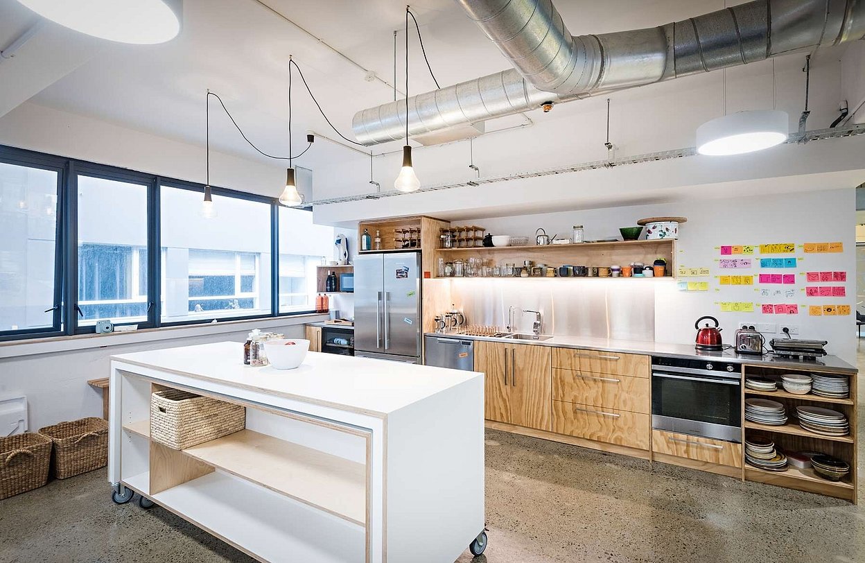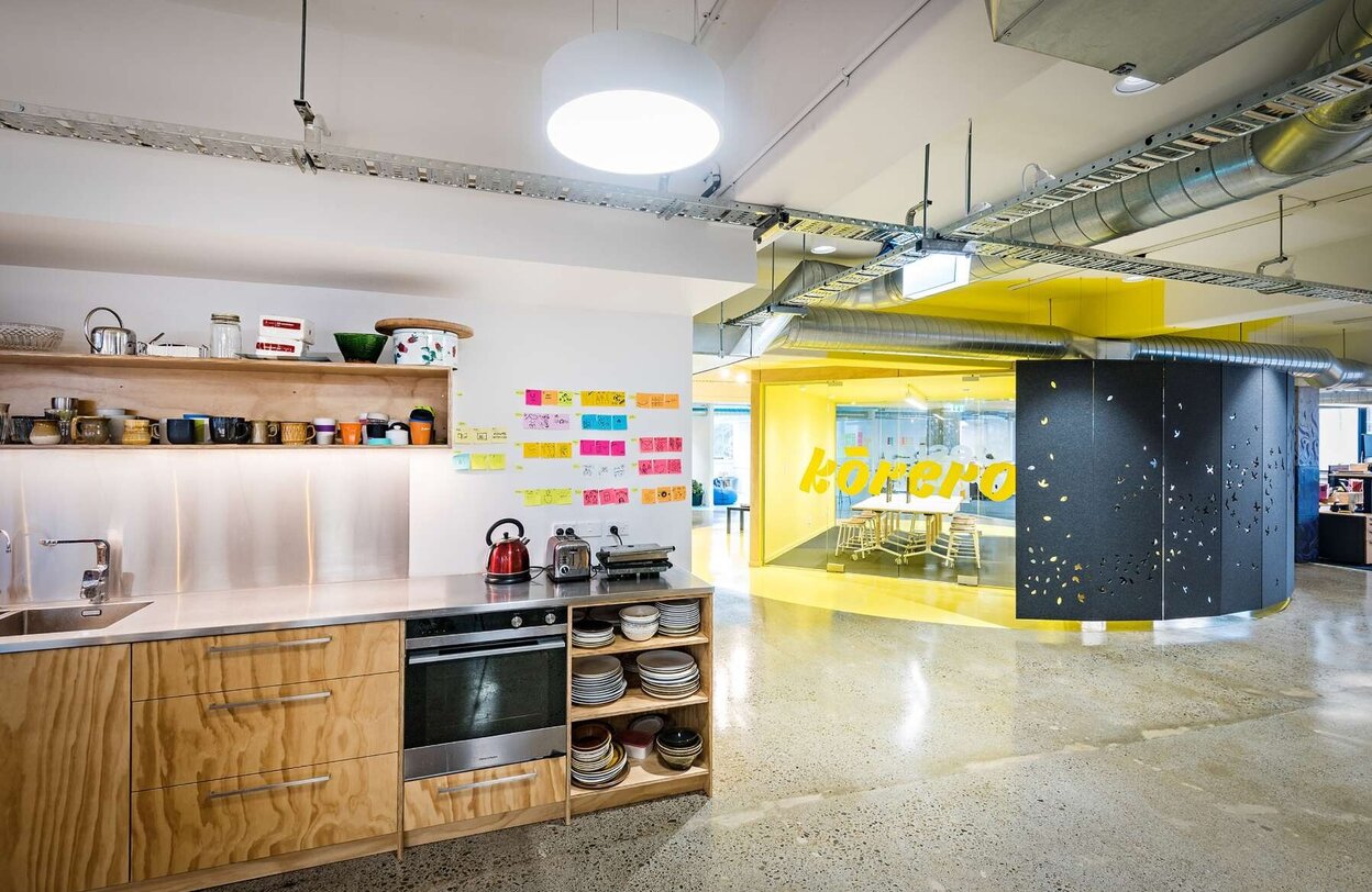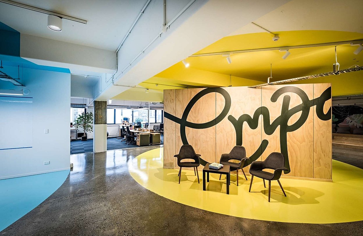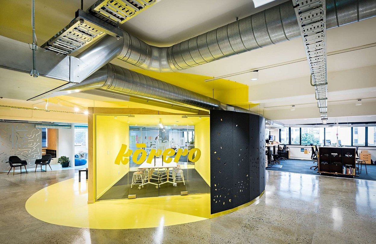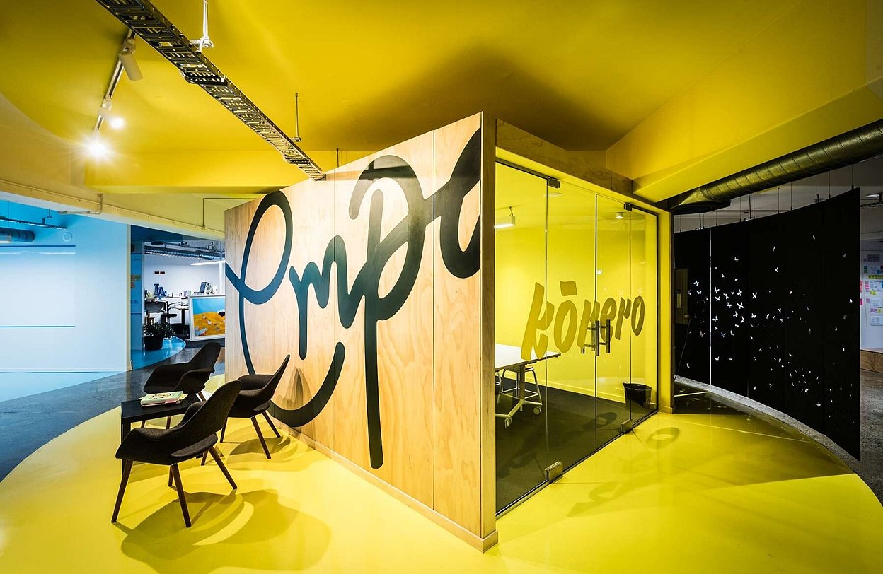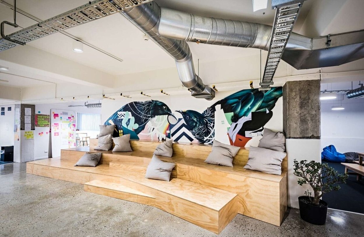 Adjacent spaces and wayfinding was then further defined with large painted circular gestures on the floor and ceiling, leading occupants through the space while delineating and characterising flexible breakout zones throughout. The existing floor plate was stripped back to its original concrete structure with the central columns receiving carbon fibre wrapped seismic strengthening. This presented an opportunity to balance refined interior finishes with the raw materiality of the existing building, which resulted in many instances of industrial elements played against ply and plasterboard, bright paint, custom street art, acoustic panelling and textiles.
