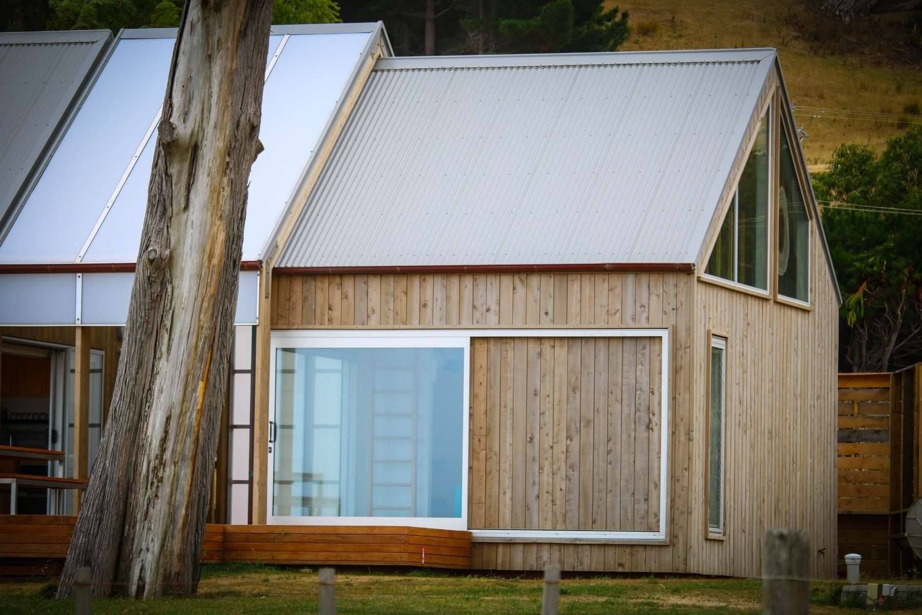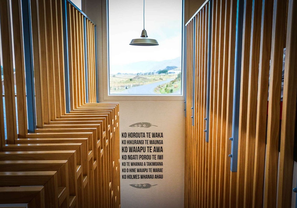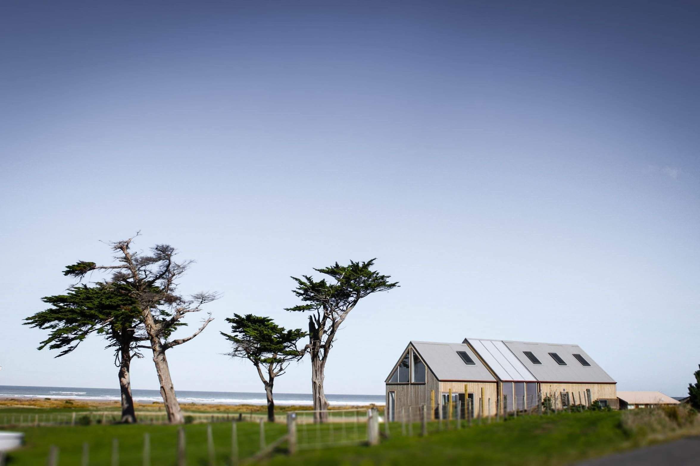 The silvered Macrocarpa cladding helps the geometric gabled forms relate to the windswept Macroparpa’s of the site. The structural Glulam portals embrace the annex building with the inherent durability and structural integrity of the material allowing for simple detailing and finishing. The interiors are finished in a variety of stained and clear finish timber against white plaster walls, creating an informal yet refined haven against the sometimes brutal outside weather.
