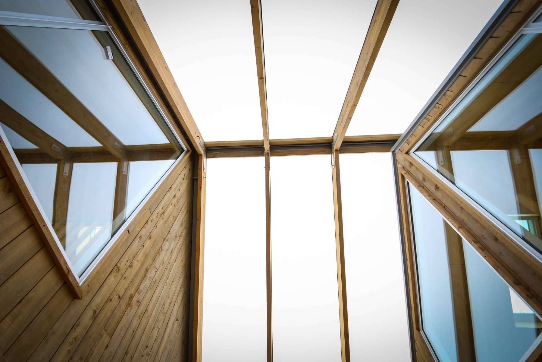 Engineered Glulam timber portals form the enclosed outdoor area, with semi-opaque polycarbonate cladding providing an accent against the weathered copper and silvered Macrocarpa of the exterior.