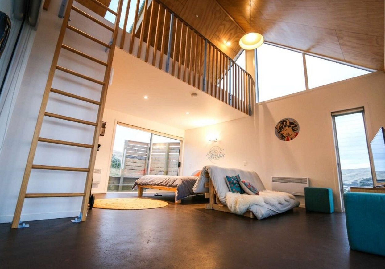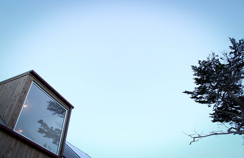 The gabled portal legs are open to the view on one side with hinged doors to the other, which can be configured to suit the conditions. With the predominant coastal views toward the south-west, the split volume and glazed gable ends allow good natural daylight light penetration without compromising an appropriate glazing/ wall ratio.