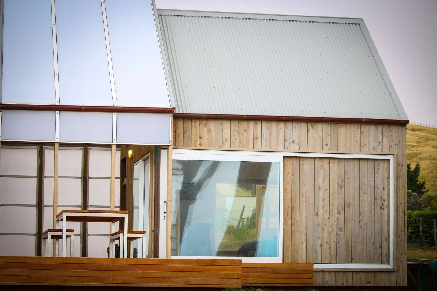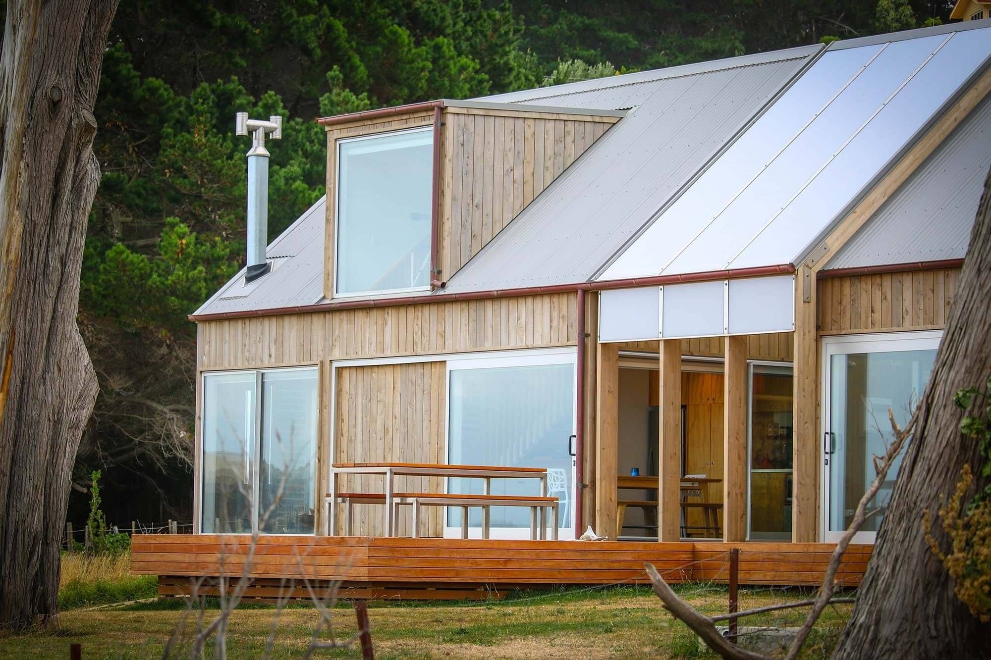 Engineered Glulam timber portals form the enclosed outdoor area, with semi-opaque polycarbonate cladding providing an accent against the weathered copper and silvered Macrocarpa of the exterior.