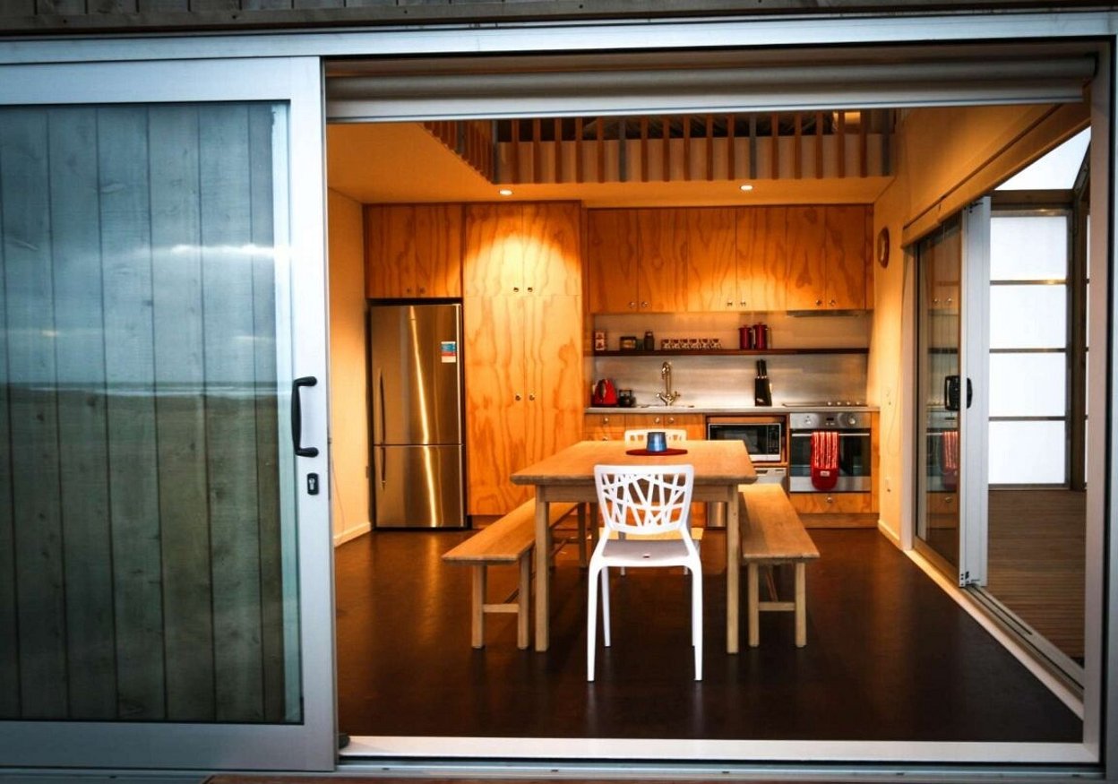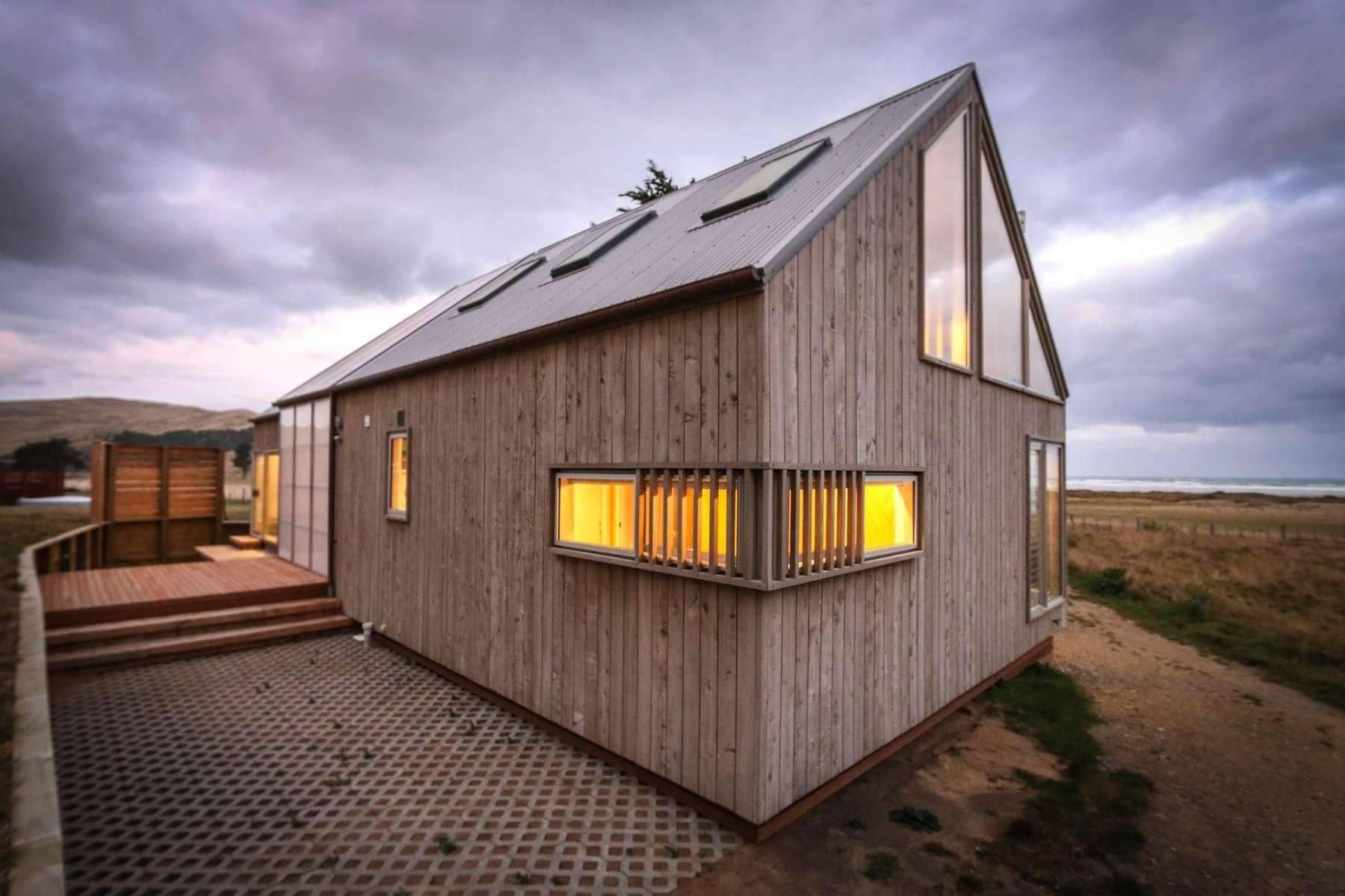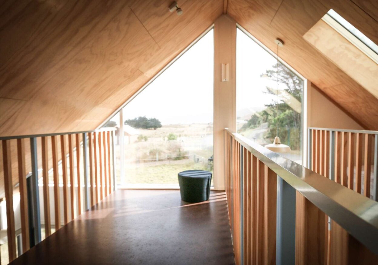 The gabled portal legs are open to the view on one side with hinged doors to the other, which can be configured to suit the conditions. With the predominant coastal views toward the south-west, the split volume and glazed gable ends allow good natural daylight light penetration without compromising an appropriate glazing/ wall ratio.
