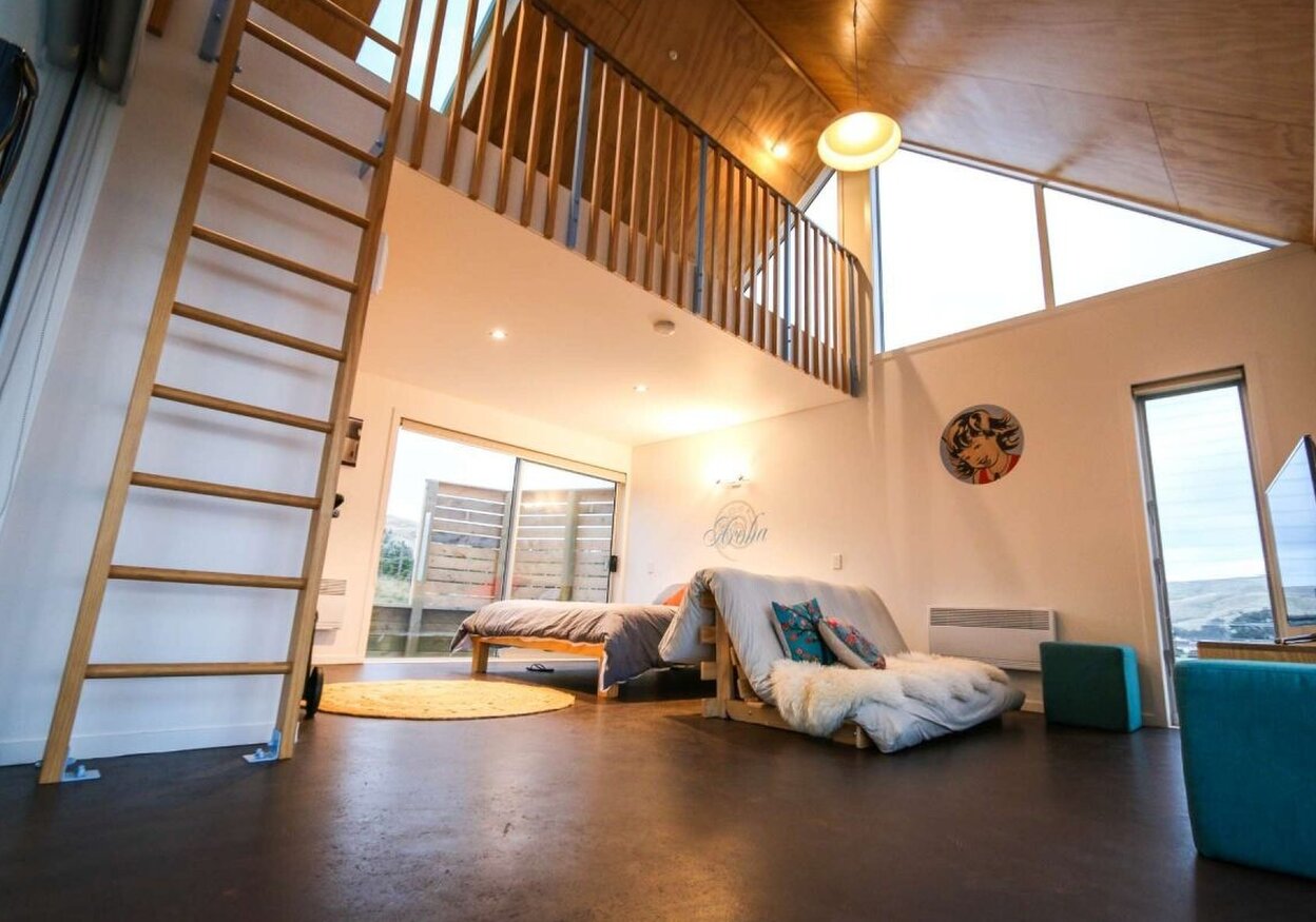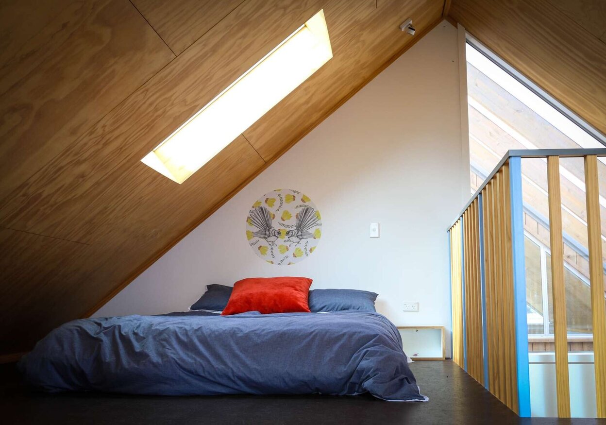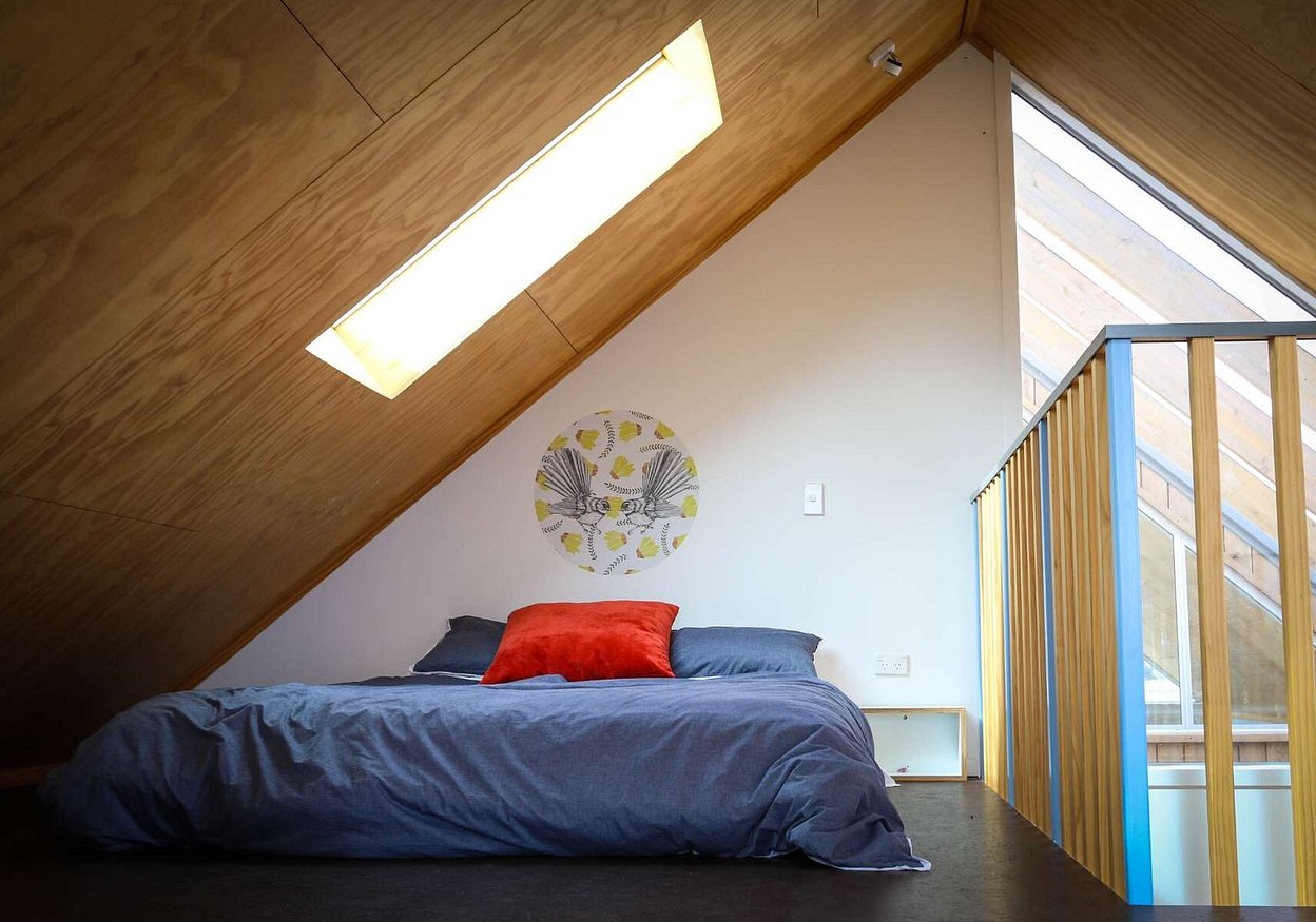 The footprint of the building is a modest 85m2 with the compact floor area offset with mezzanine levels and connected decks, while the annex building facilitates various functions allowing for a flexible use of space. The main building contains living, single bedroom, kitchen, bathroom/laundry as well as an external bathroom servicing the separate sleeping/living building. The outdoor ablutions and open plan “marae style” sleeping exploit the informal expectations of the bach typology while allowing for efficiencies in planning and services.