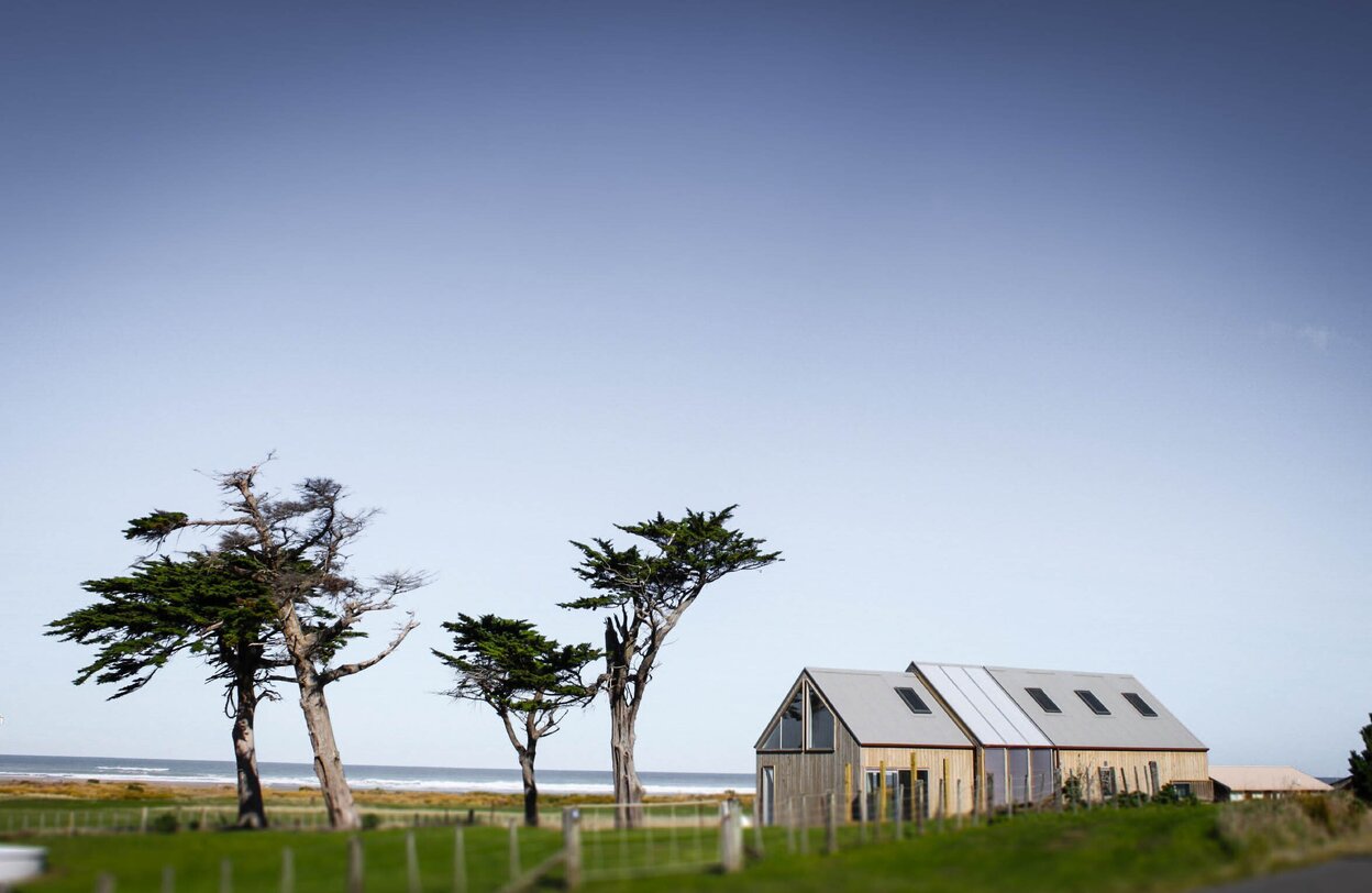 The silvered Macrocarpa cladding helps the geometric gabled forms relate to the windswept Macroparpa’s of the site. The structural Glulam portals embrace the annex building with the inherent durability and structural integrity of the material allowing for simple detailing and finishing. The interiors are finished in a variety of stained and clear finish timber against white plaster walls, creating an informal yet refined haven against the sometimes brutal outside weather.