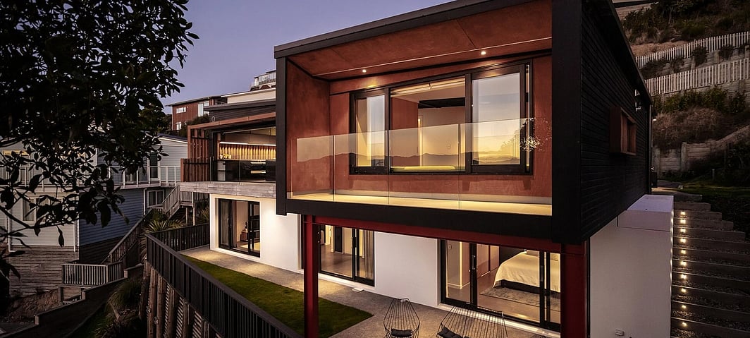 Black steel + Cedar clad forms suspended over terraced parking area with cantilevered deck – dramatises the views of the Remarkables and Frankton Arm. The interior is low maintenance: float finished concrete, ply, tiles + dark tone walls with industrial fittings playing rugged off refined.