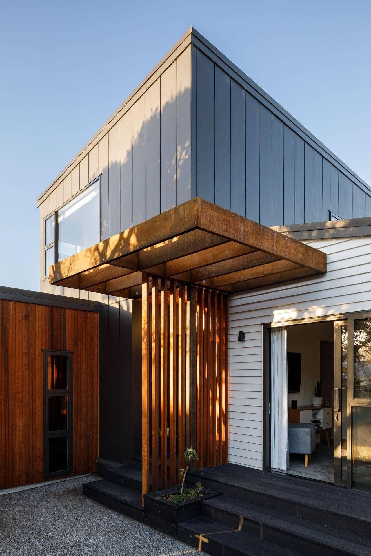 The exterior is a composition of cedar and painted fibre cement forms in dialogue with the original white weatherboard portion of the retained building. This provides a reference to the site’s history while introducing a more current architectural conversation to the street-scape.