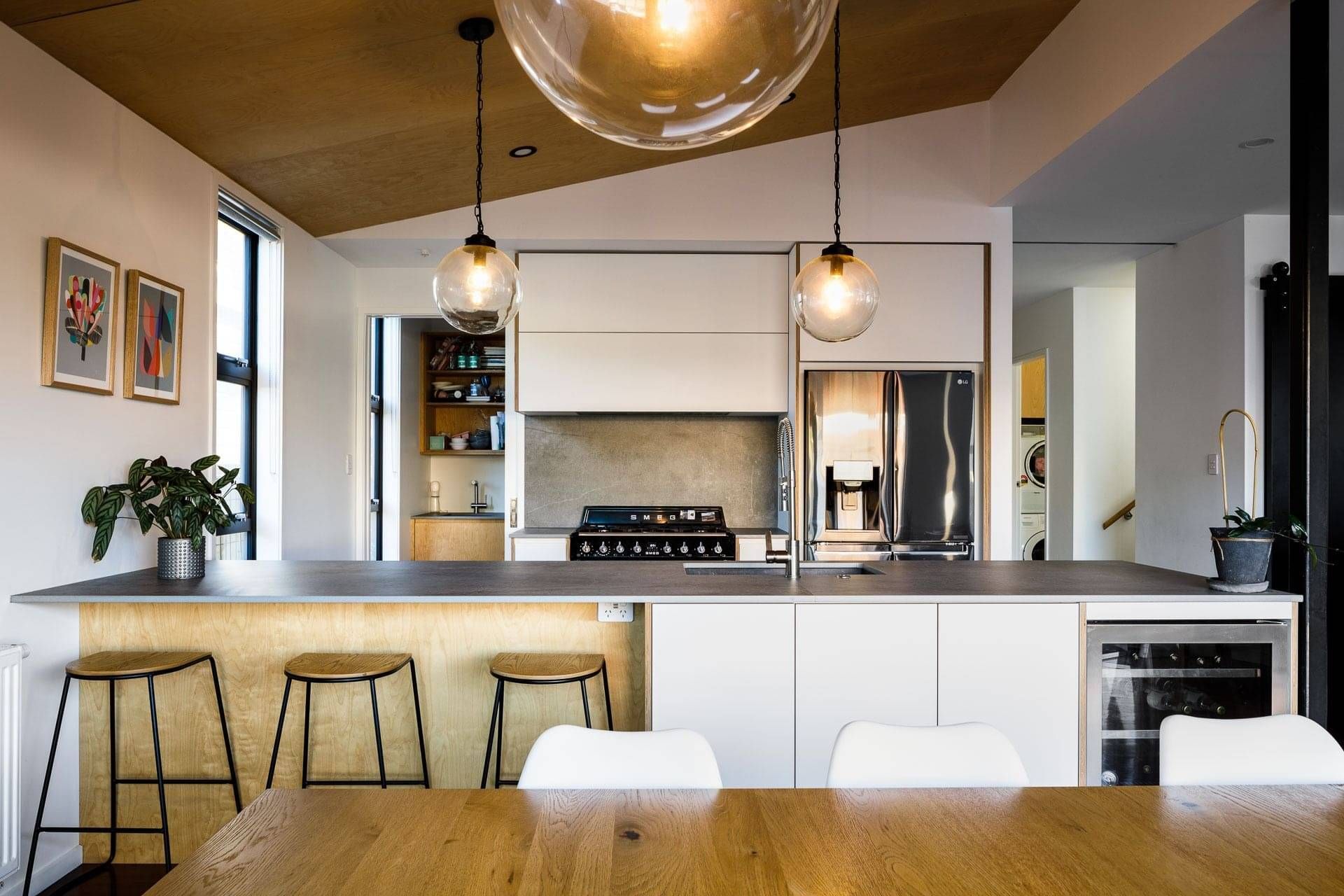 The interiors are a blend of crisp and functional finishes (engineered stone, high-pressure laminate, tiles, ply) offset by the character of the original floor boards in a dark stain, which in turn relates well to some of the introduced industrial elements such as internal sliding barn doors, exposed structural steel and freestanding fireplace.