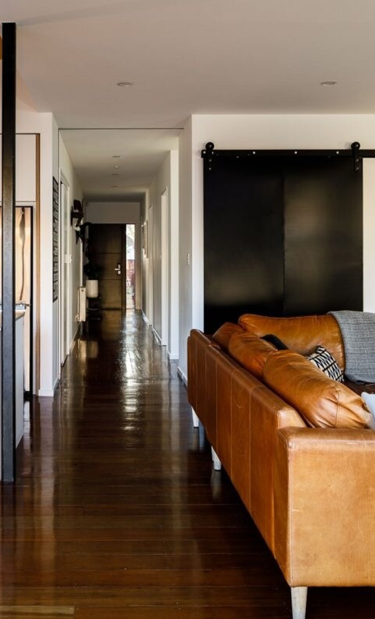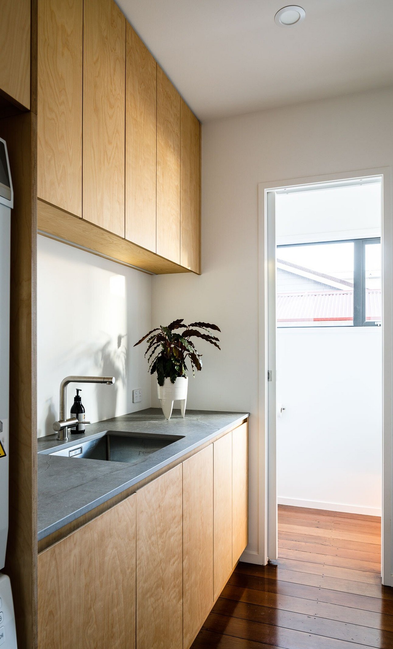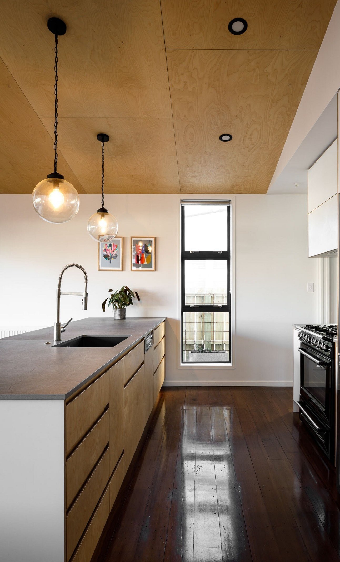 The interiors are a blend of crisp and functional finishes (engineered stone, high-pressure laminate, tiles, ply) offset by the character of the original floor boards in a dark stain, which in turn relates well to some of the introduced industrial elements such as internal sliding barn doors, exposed structural steel and freestanding fireplace.