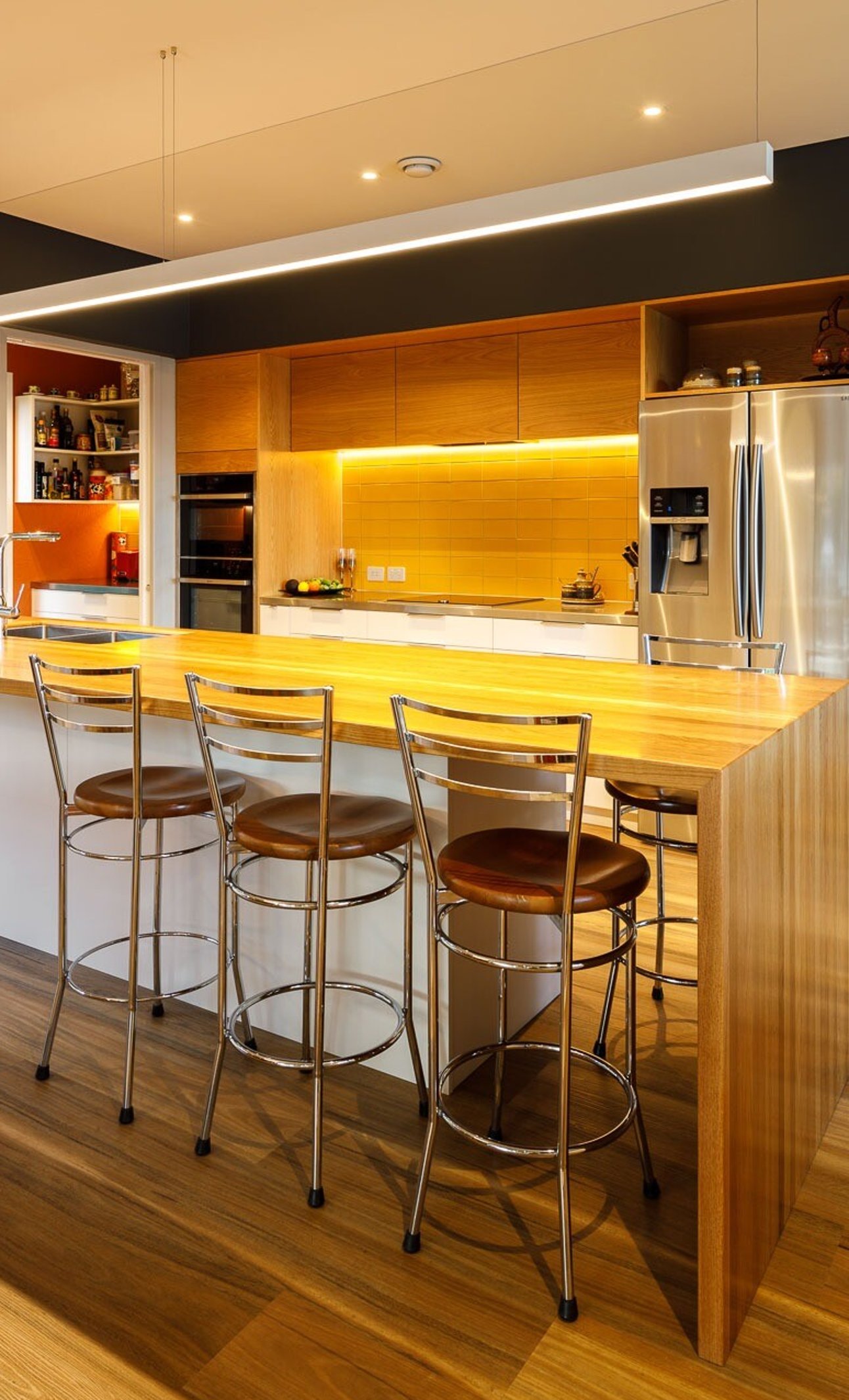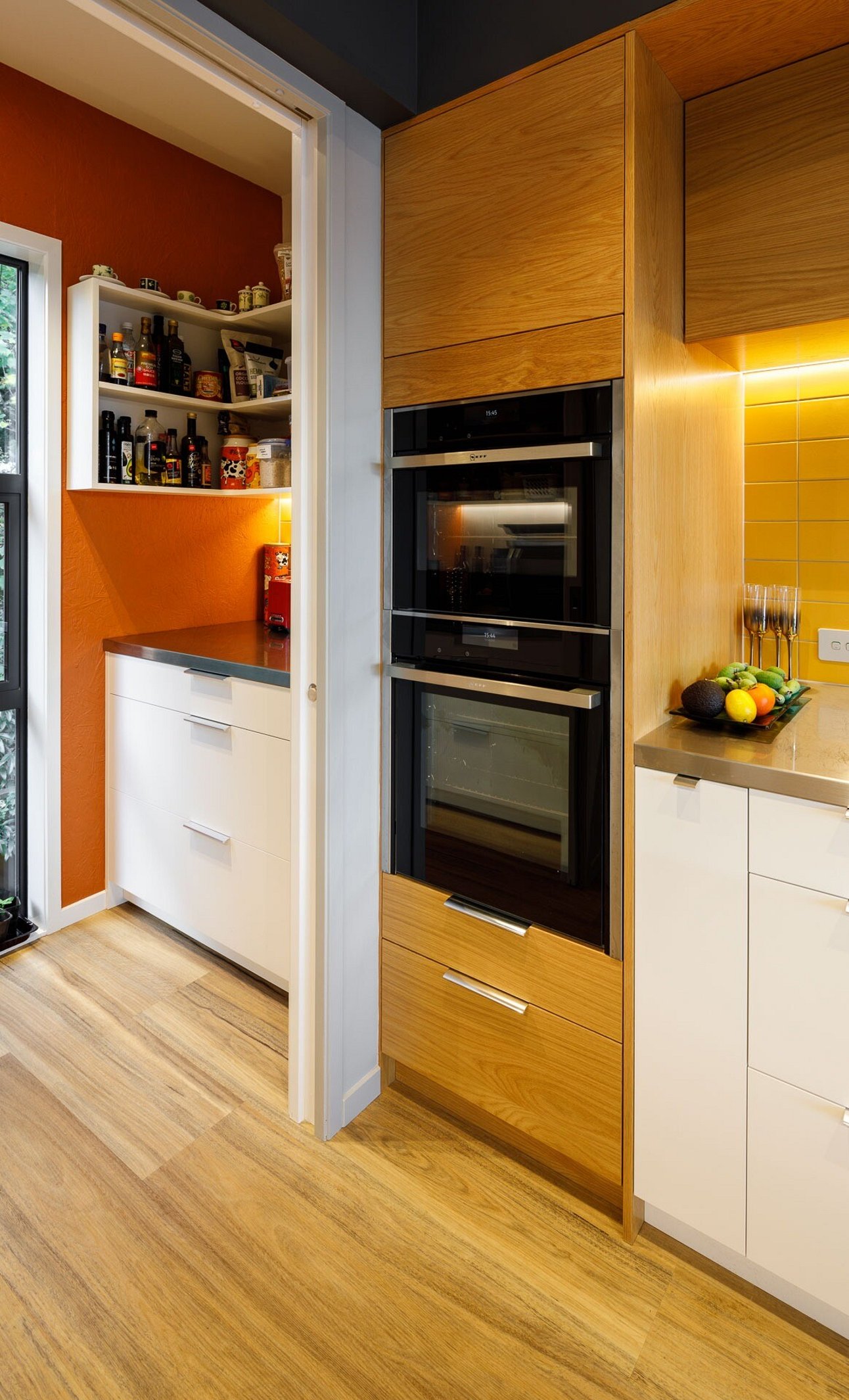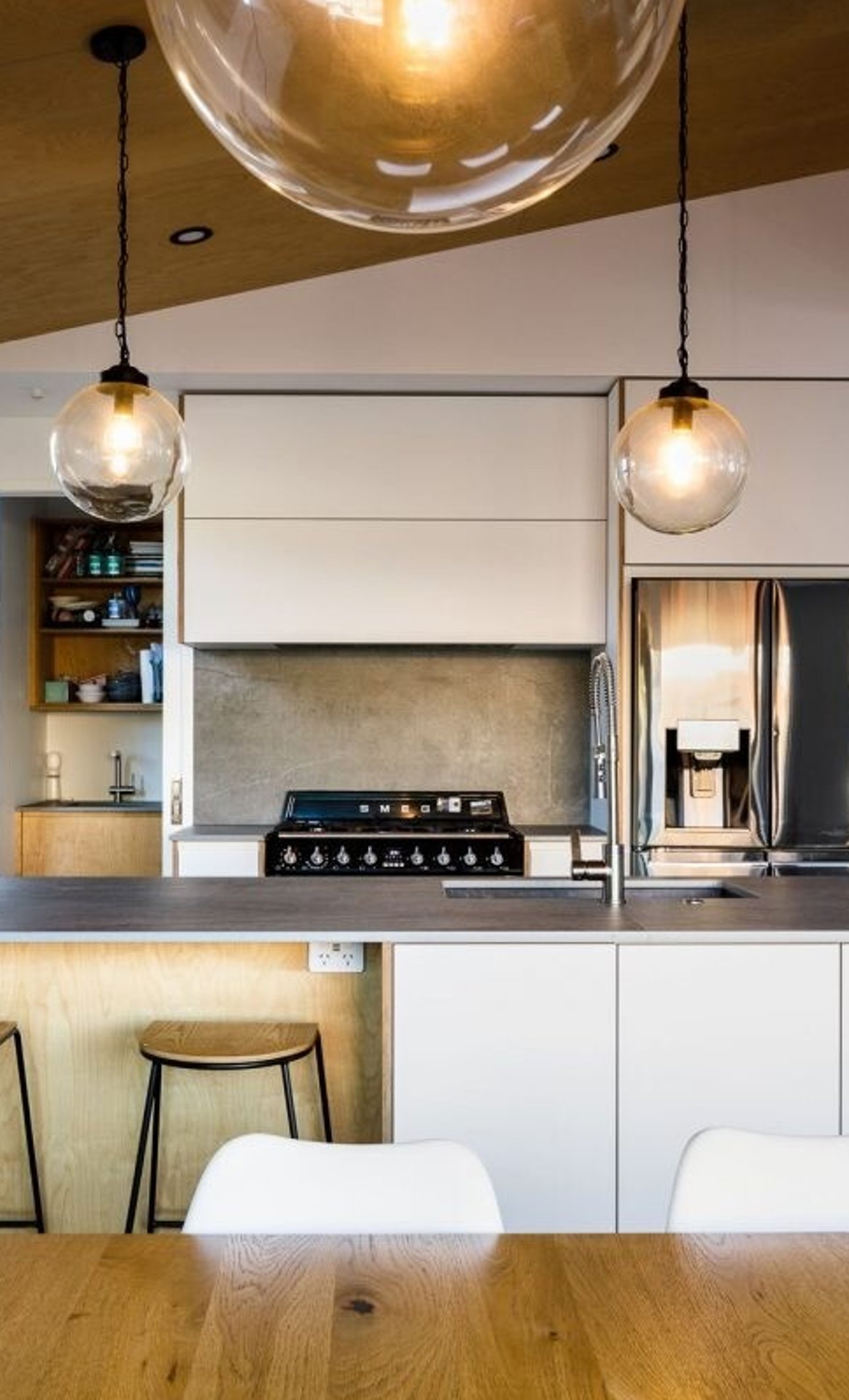 The interiors are a blend of crisp and functional finishes (engineered stone, high-pressure laminate, tiles, ply) offset by the character of the original floor boards in a dark stain, which in turn relates well to some of the introduced industrial elements such as internal sliding barn doors, exposed structural steel and freestanding fireplace.