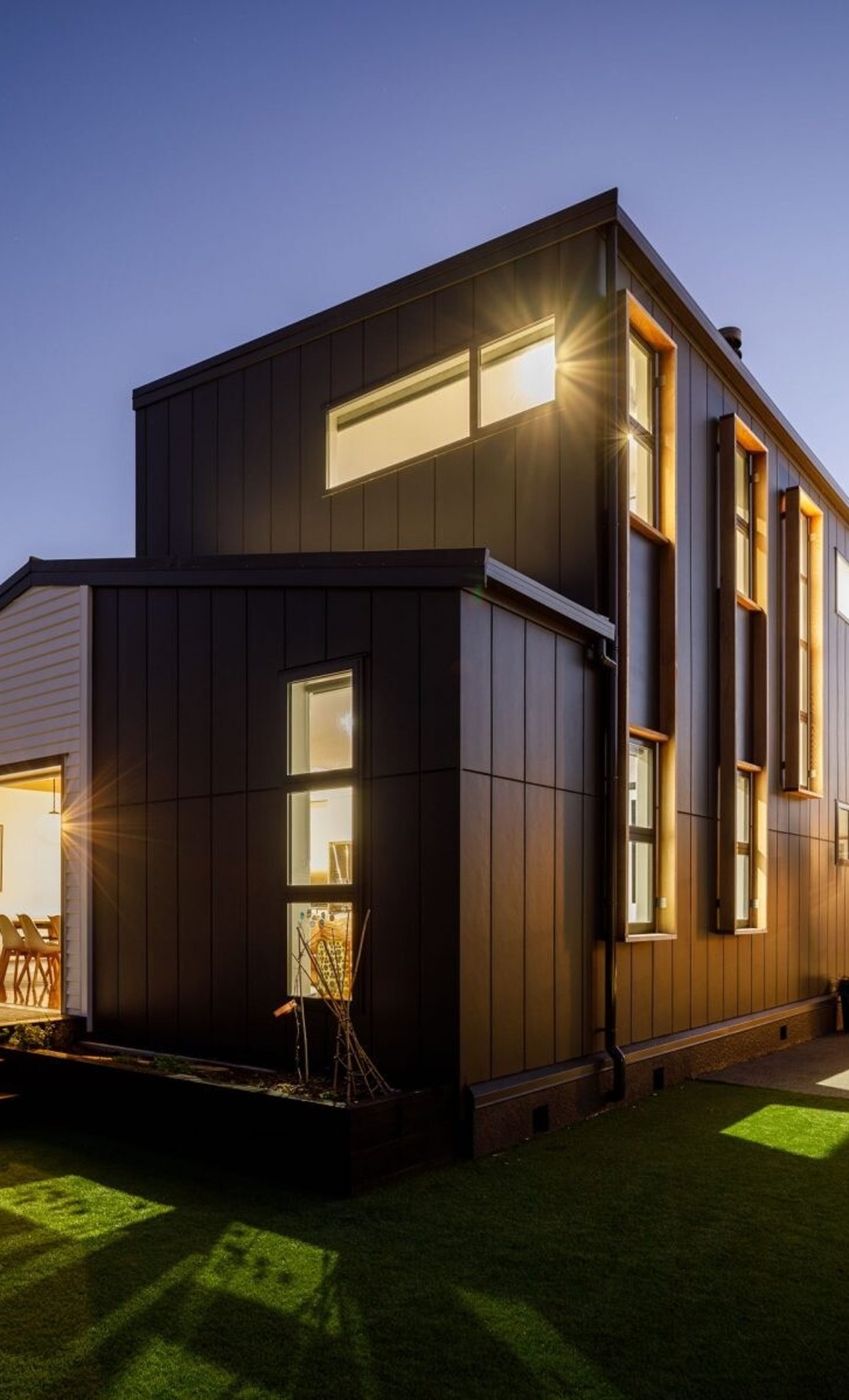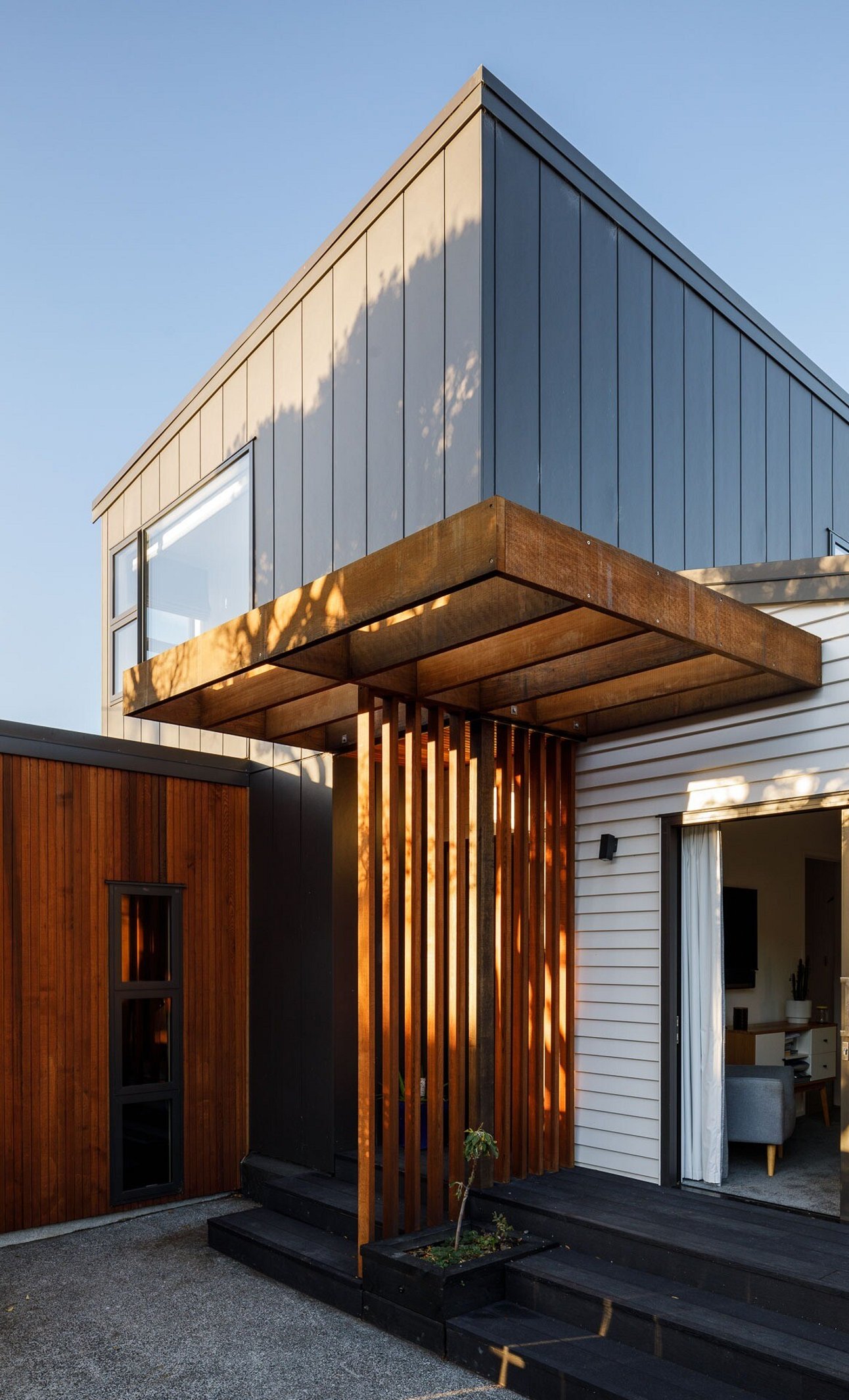 The exterior is a composition of cedar and painted fibre cement forms in dialogue with the original white weatherboard portion of the retained building. This provides a reference to the site’s history while introducing a more current architectural conversation to the street-scape.