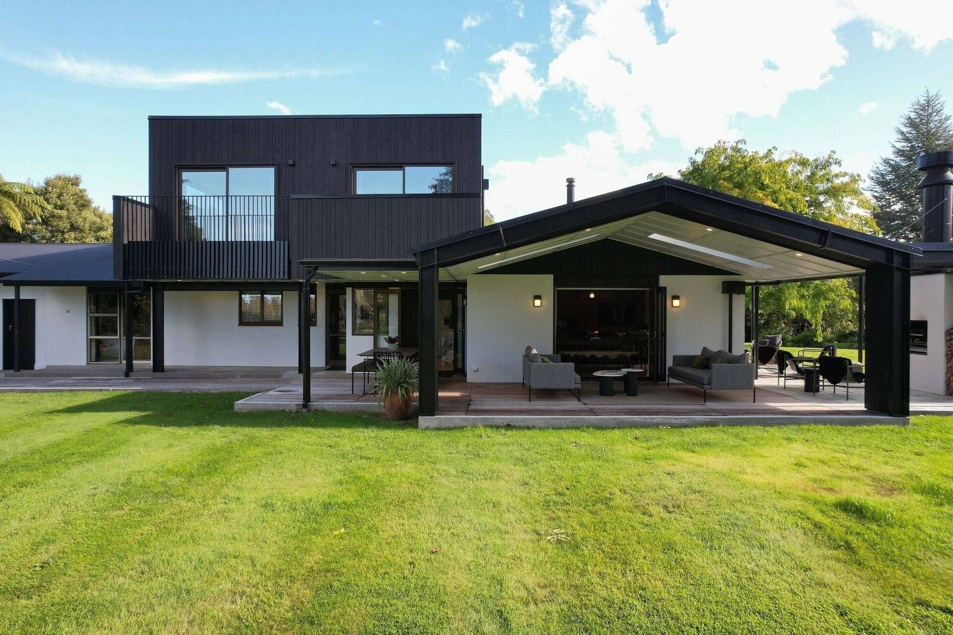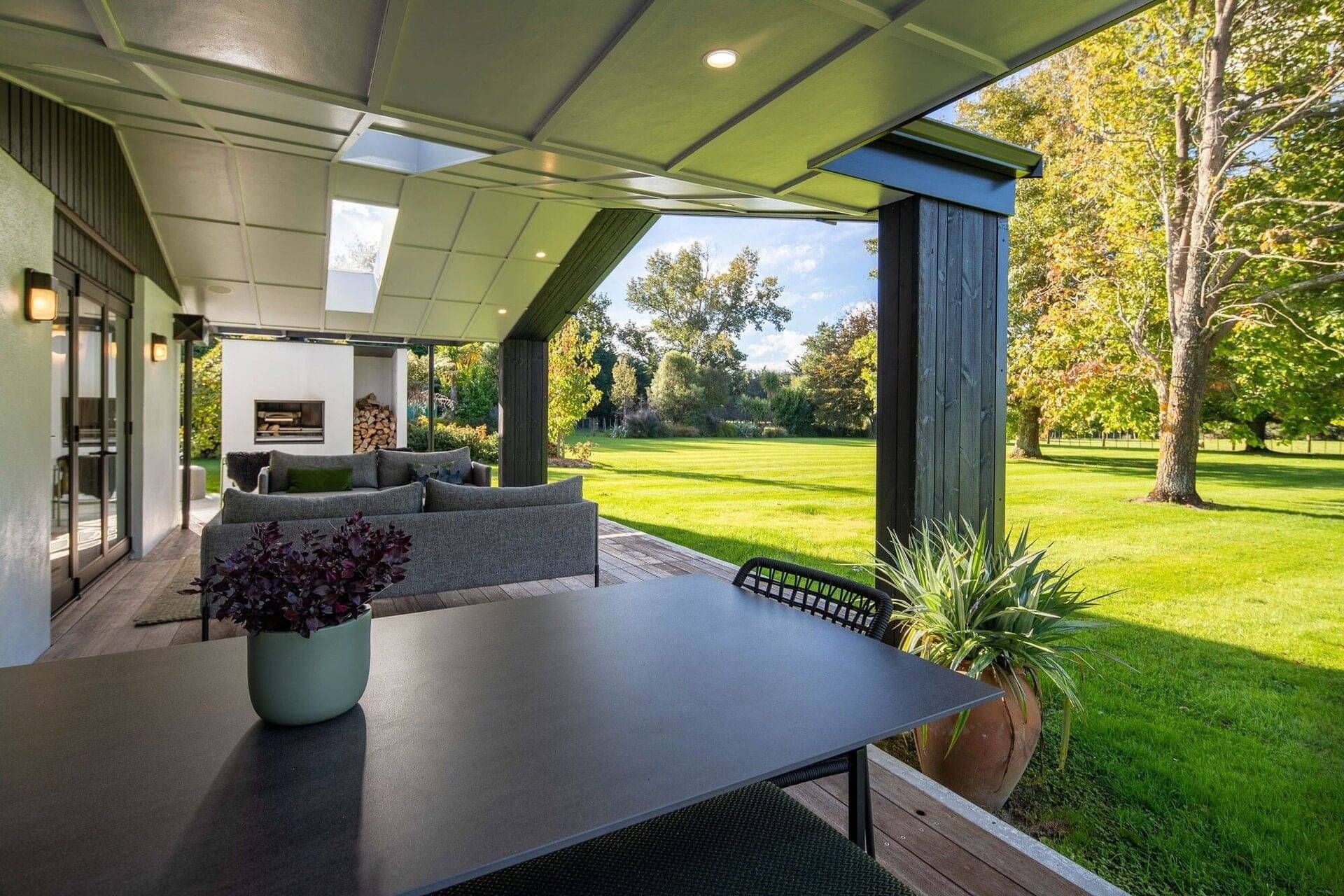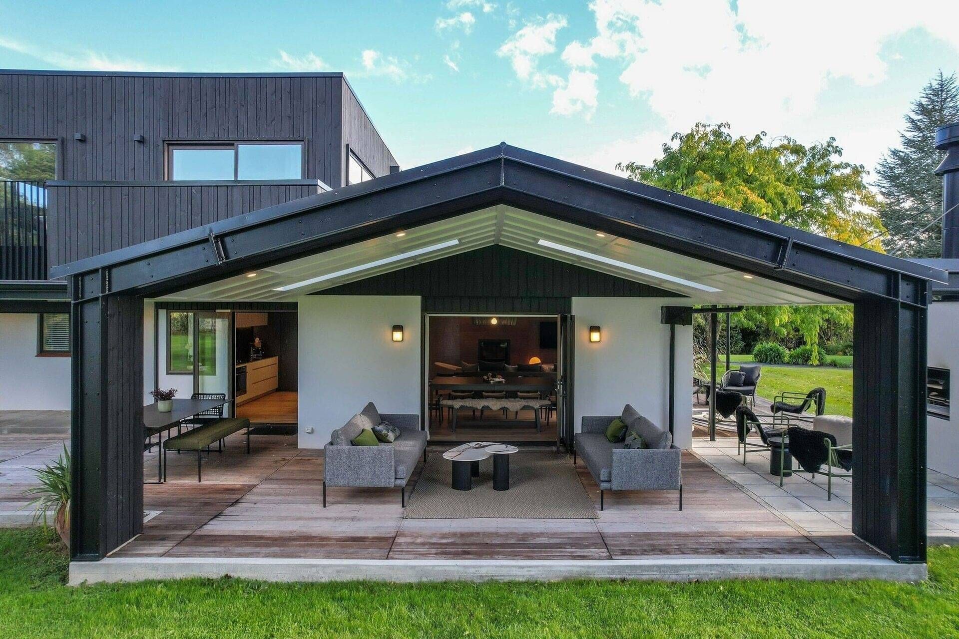 The architectural response is a bold intervention that utilises a variety of roof forms to create a visually striking addition that stands in contrast to the original farmhouse. The new covered outdoor spaces are designed to connect seamlessly with the surrounding landscape, with a mix of low pitched membrane and polycarbonate pergolas creating various outdoor living zones for dining, sitting, and outdoor cooking.