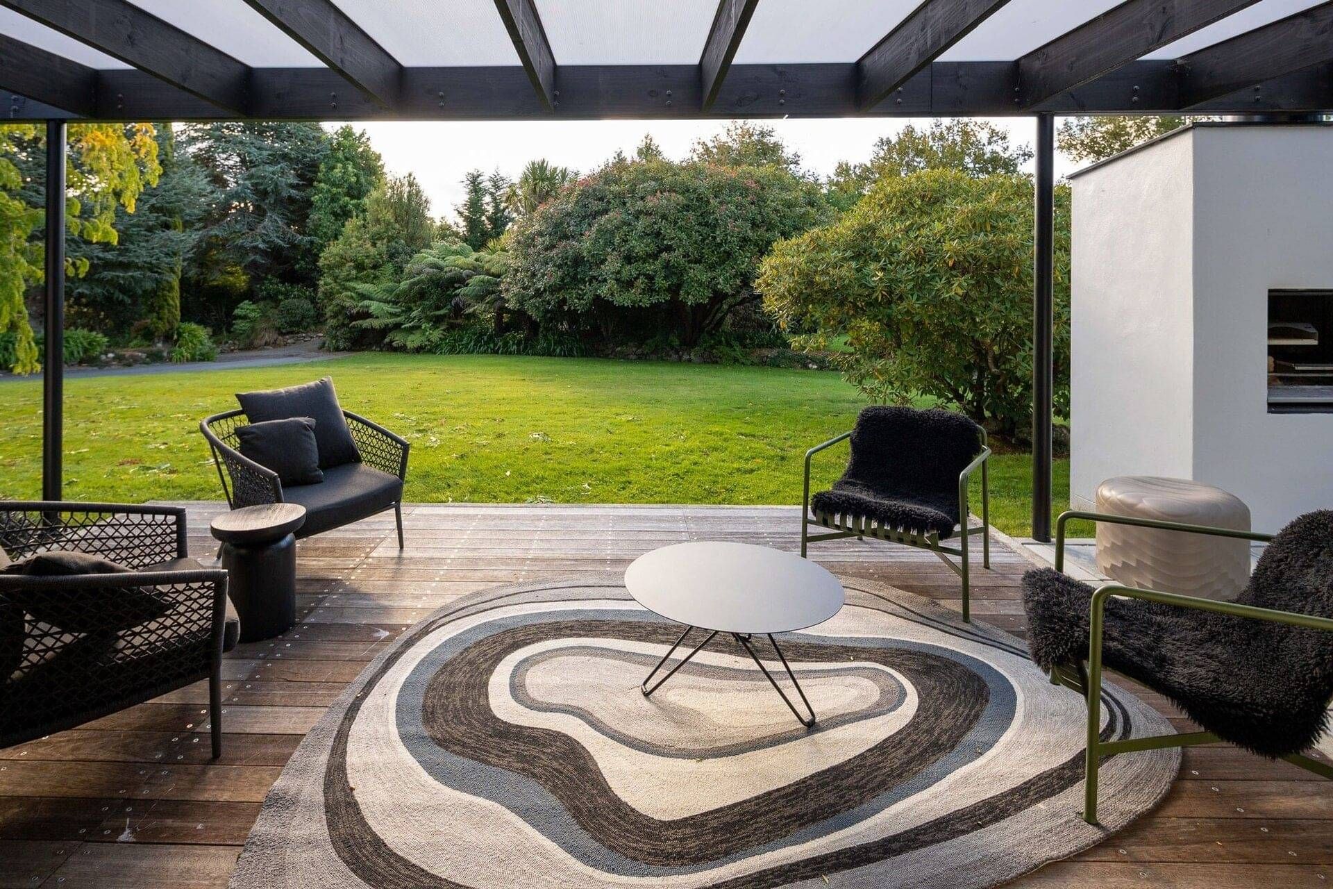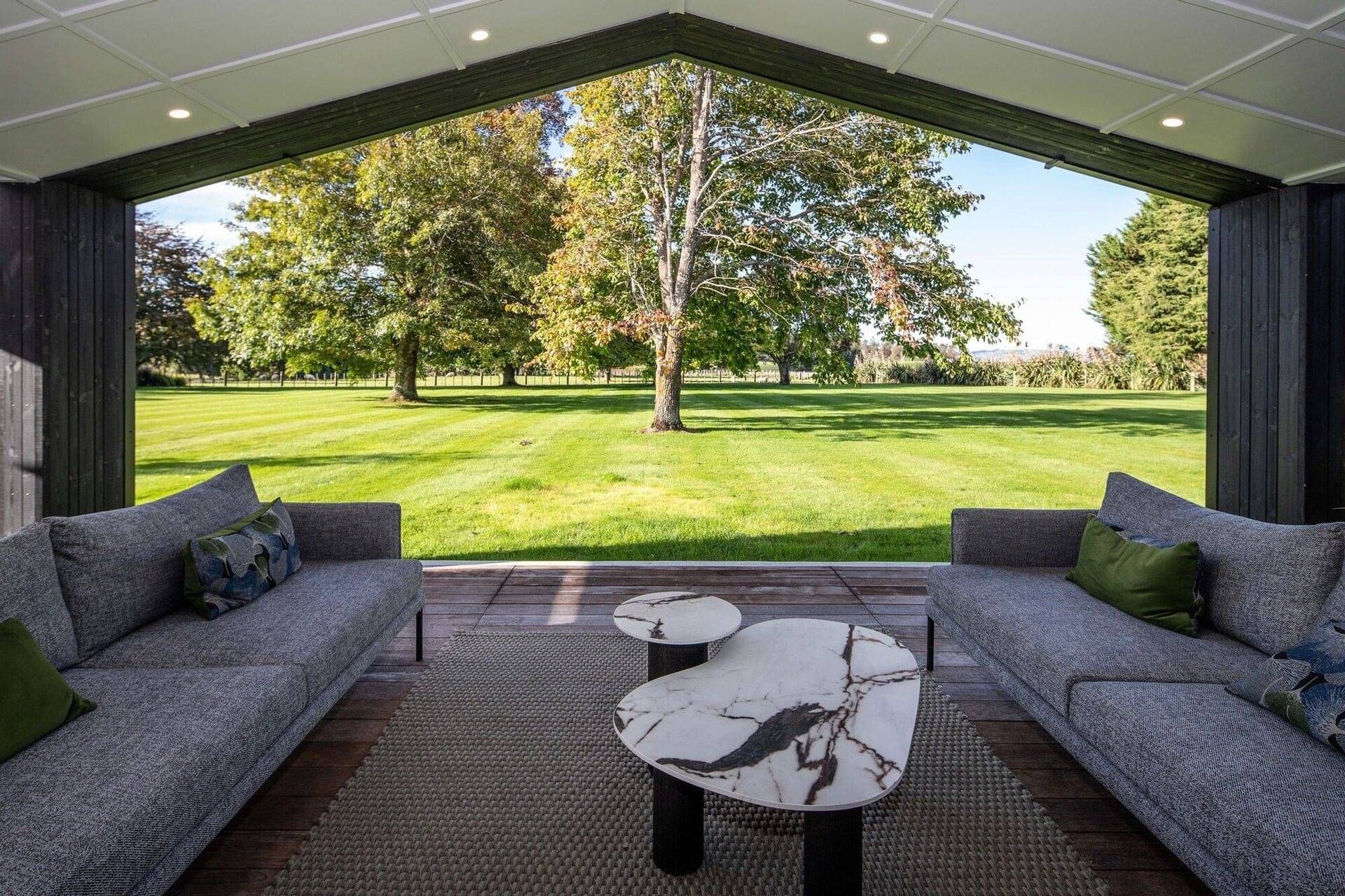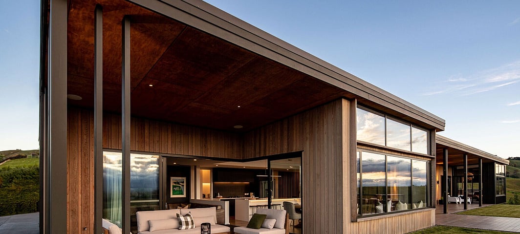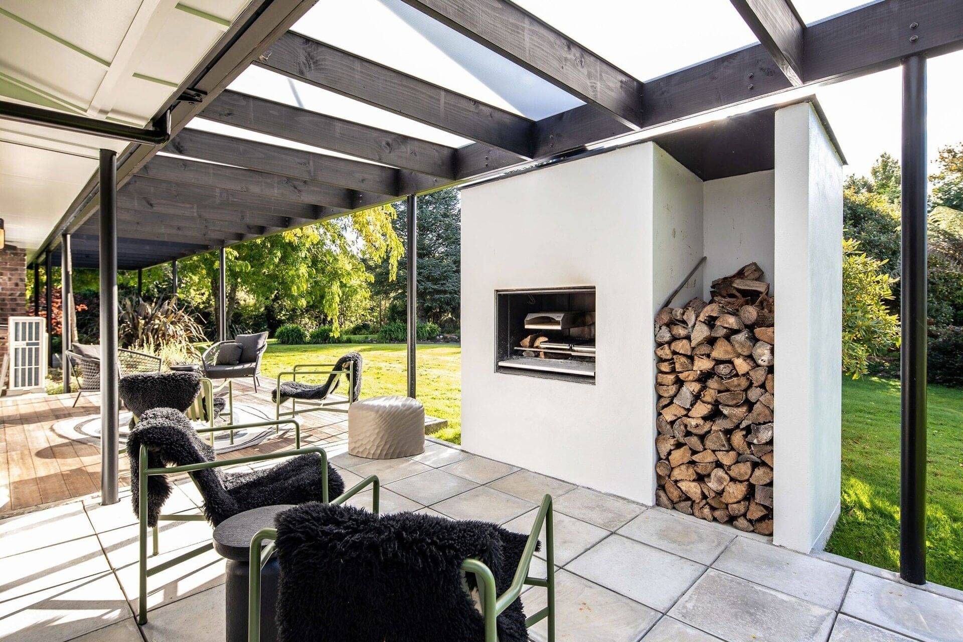 The architectural response is a bold intervention that utilises a variety of roof forms to create a visually striking addition that stands in contrast to the original farmhouse. The new covered outdoor spaces are designed to connect seamlessly with the surrounding landscape, with a mix of low pitched membrane and polycarbonate pergolas creating various outdoor living zones for dining, sitting, and outdoor cooking.