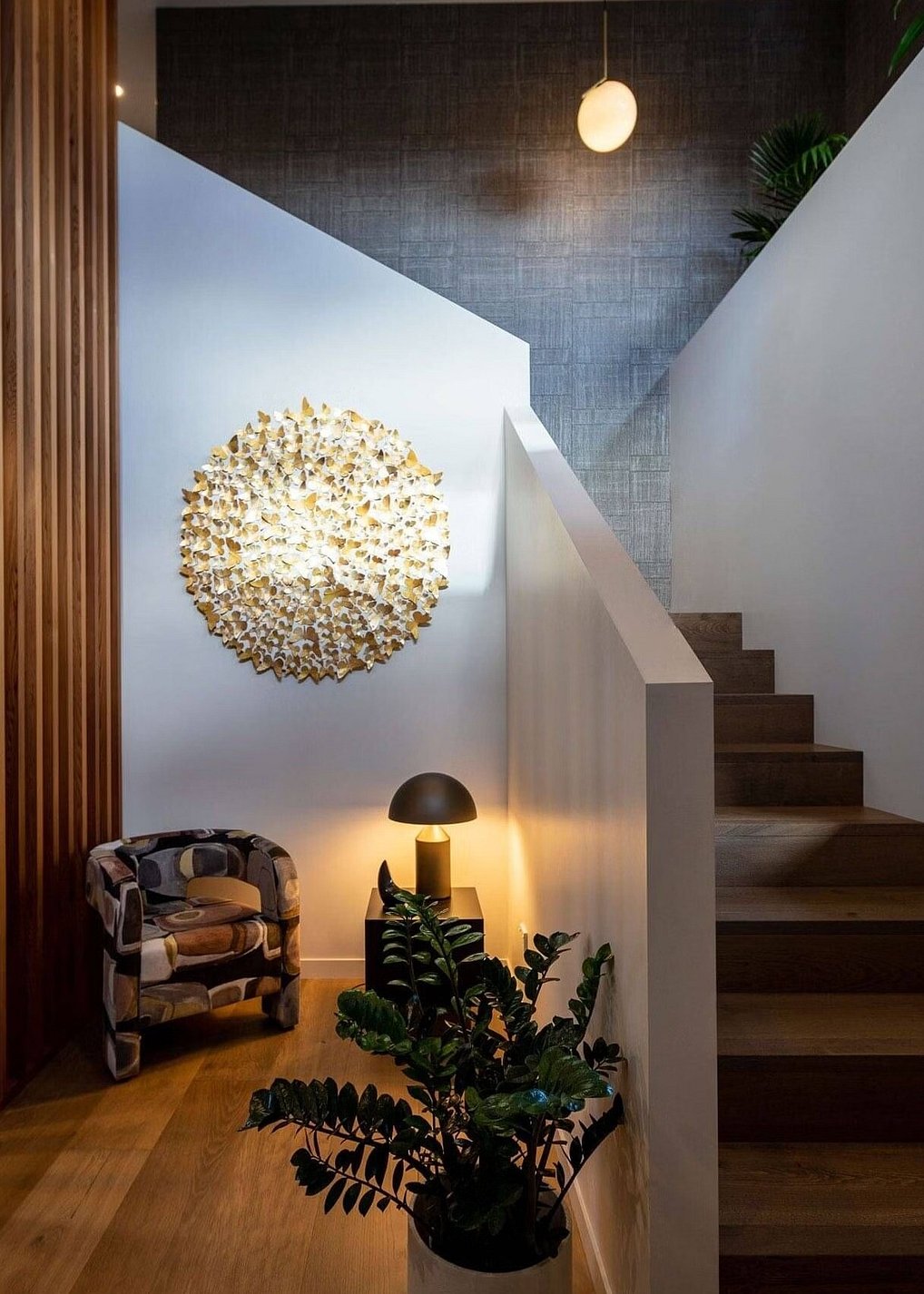 The interior design, carried out by the Design Co, is a beautiful and complementary addition to the architecture with the use of oak flooring, stained timbers, marble benchtops, and a textural palette of rusted reds and deep greens. This creates a warm and inviting atmosphere that perfectly complements the bespoke furniture and lighting selections along with an internal garden that brings a touch of nature into the heart of the home.