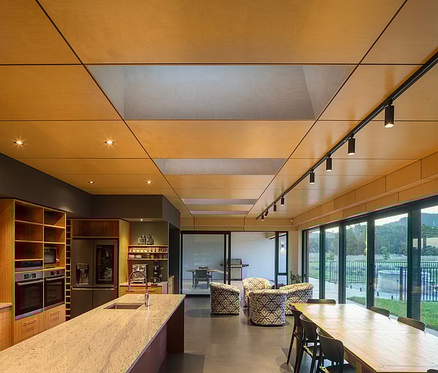 Internally, the material palette brings warmth and depth. Timber is used extensively throughout the joinery, grounding the spaces and adding a sense of craftsmanship and continuity. This is reinforced by a strong, consistent ceiling language - panelled timber ceilings run throughout both interior and exterior spaces, drawing the eye through the home and extending the architecture outward into the covered outdoor areas.